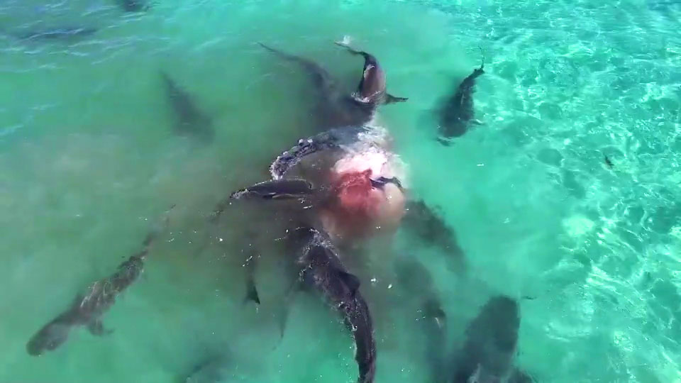 Incredible drone footage has emerged of over 70 huge tiger sharks tearing apart a dead humpback whale in the crystal clear waters of Shark Bay, on the Western Australia coastline.