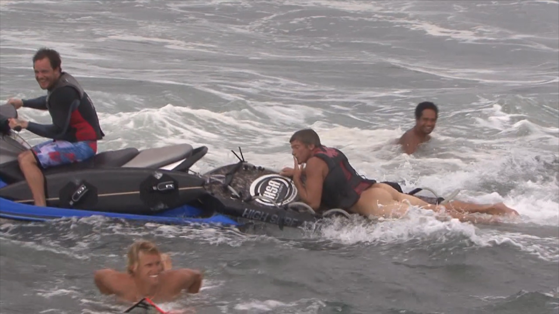 Surely a wipeout this big in front of a crowd would have been enough embarressment for one day, however Bruce emerges from the white wash revealing that the wave claimed his shorts too, sending the crowd into hysterics. What a day!