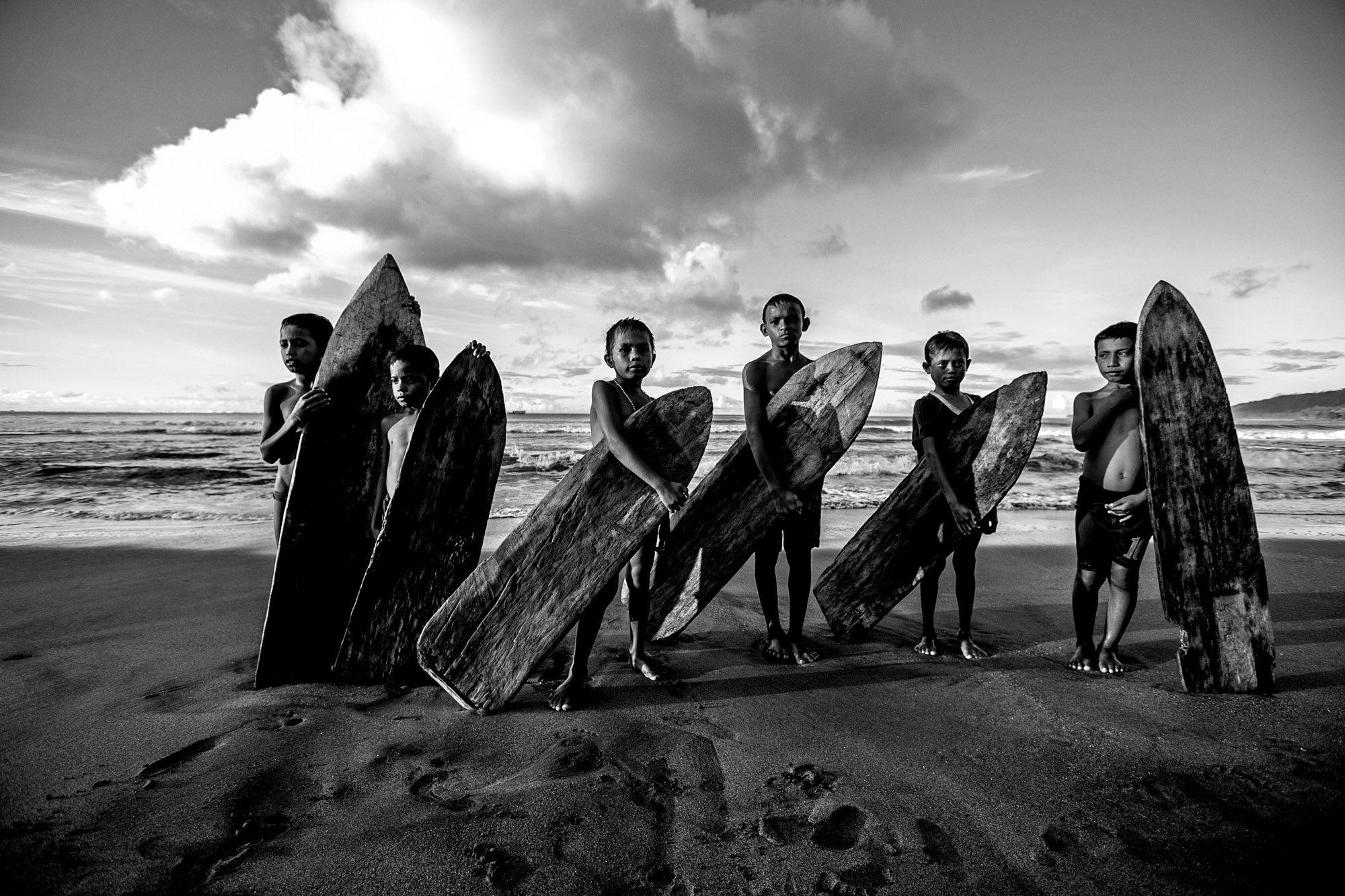 February 2014 Local kids surfing wooden boards-Searching for waves in the Pacific Ocean, Northern Indonesia with Indonesian surfers Marlon Gerber and Mega Semadhi aboard the Pulse surf charter boat. Photo Jason Childs  Photo Credit-(c)Jason Childs