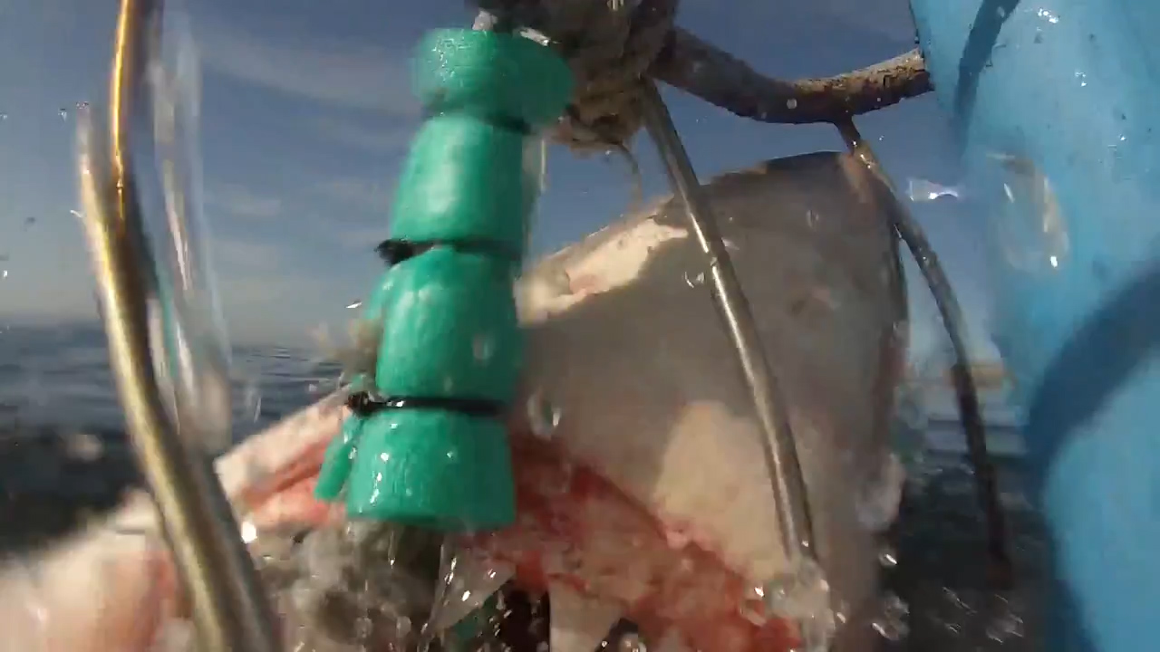 This week in gratuitous shark news we have a Great White (quite loudly and scarily) chomping on bait hanging off the side of a charter boat as another Great White decides to get in the frame in a rather enthusiastic way: