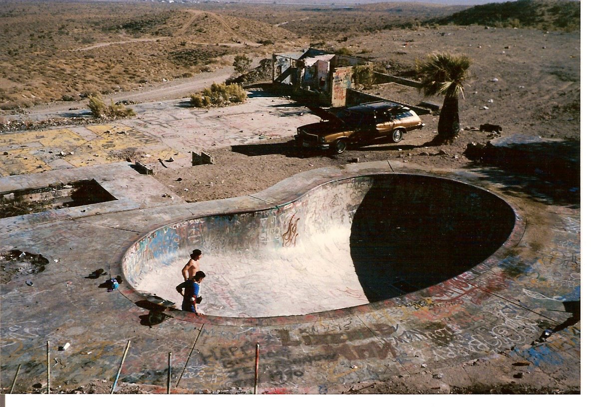 Located in the Desert Springs of California lies the nude bowl, once part of an old abandoned nudist colony named ‘Desert Gardens Ranch’ (hence the name) the nude bowl play host to some of the best bowl shredding of the 70’s and 80’s skate scene. Good times and some damn impressive bowl skating use to go down, people would come far and wide to shred or at least attend the infamous parties hosted by the local skaters.