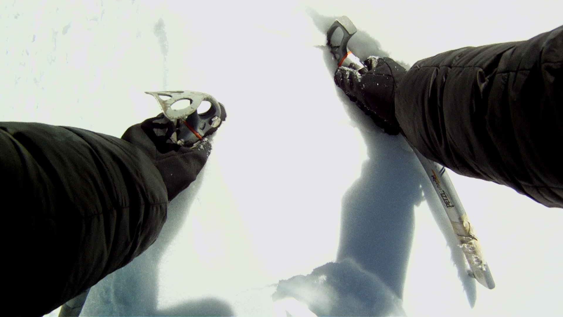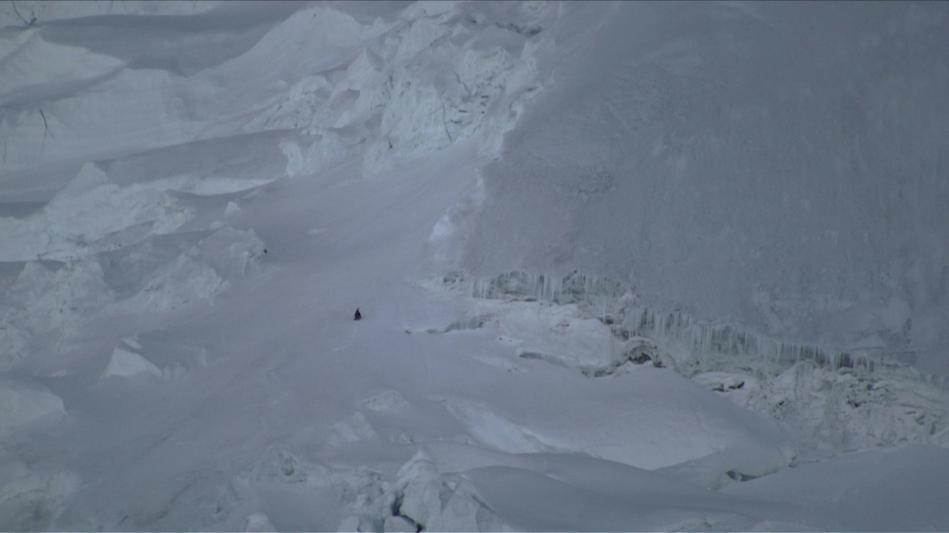 After reaching the bottom of one the main glacier he get a bad feeling. He goes back the the tente where Bjarne is resting. A few minutes later a massive serac falls exactly where he turned around earlier on.