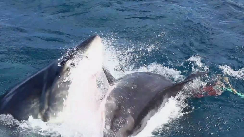 It’s Jaws on Jaws action – cameraman Adam Malski said : ‘I asked the dive master and skipper of the boat what would happen if a smaller shark got in the way of a larger shark, and the skipper responded, ‘The big shark would take the smaller one down’.