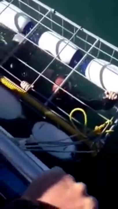 In what they assumed was a secure shark cage, the group got as close as they possibly could to the edge in hopes of getting a better view…