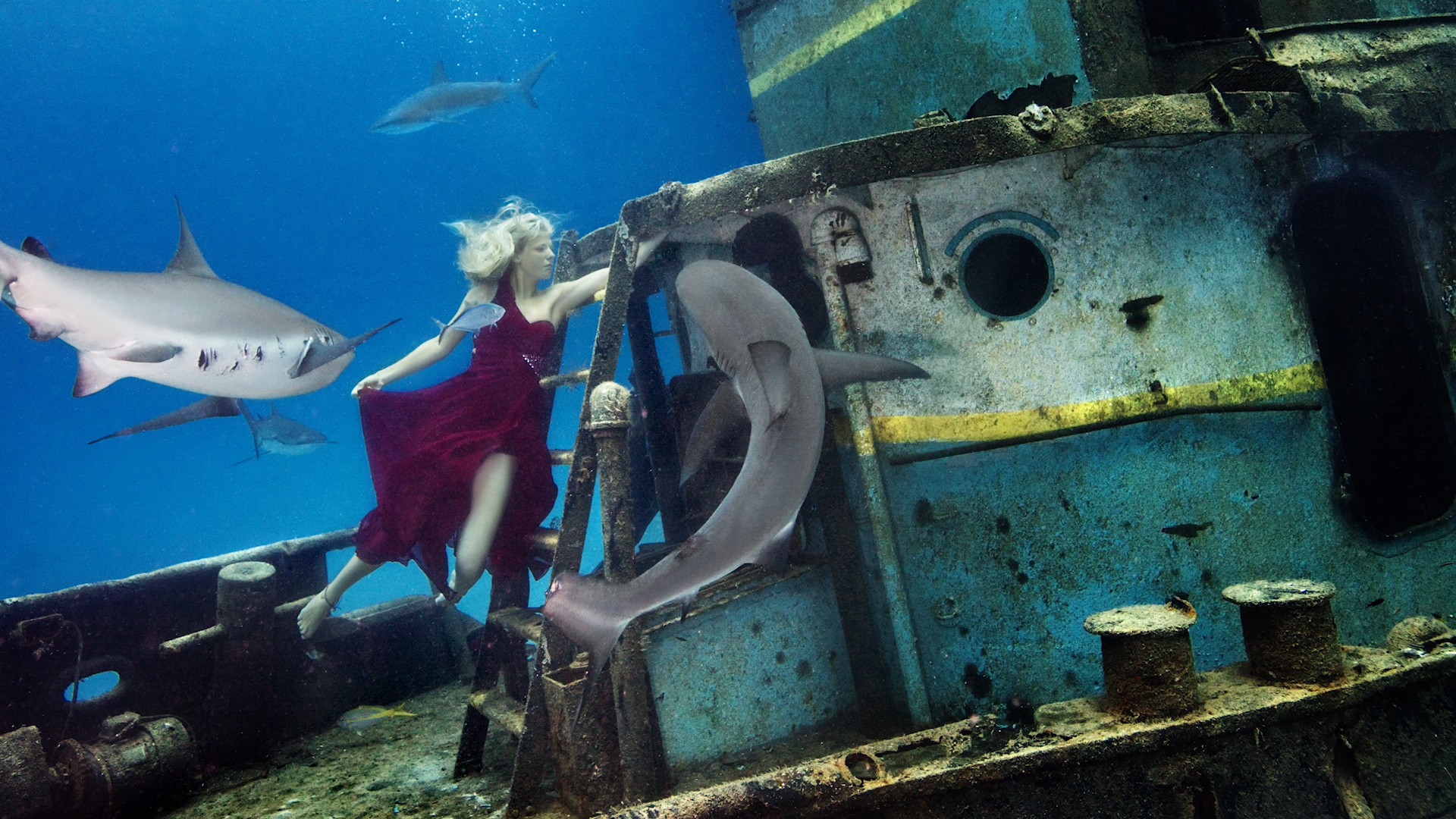 This incredible shoot features models, hammerhead sharks, tiger sharks, whales, manatees, sunken ships and beautiful clothing to match. Check out the behind the scenes here: