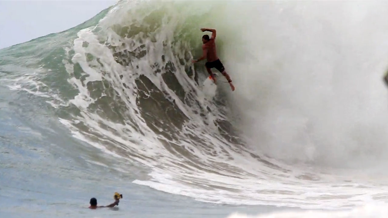 How to avoid the backwash? Go the first wave of the set, because the backwash goes under the subsequent waves and creates giant wobbly barrels over the super hard-packed sand and rocky bottom.