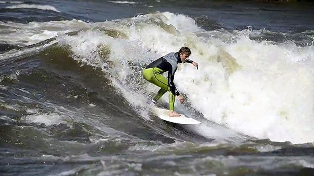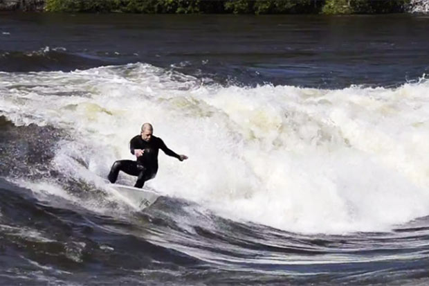 For this Norwegian river to surge and form properly you’d need a few days of heavy rain to create flooding and a fast flowing river. Legendary snowboarder Terje Haakonsen and Olympic slopestyle silver medallist Ståle Sandbech were in the right place at the right time when the river wave was on, See what the boys get up to on the off season, a little shaky to start with but they get the hang of it: